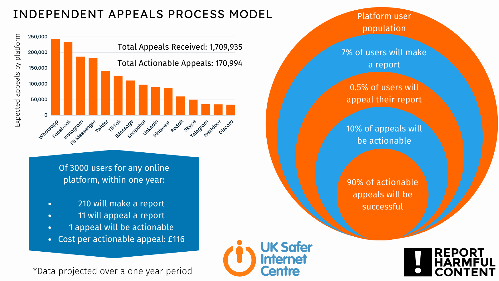 This model would act as the framework for what the Government could expect in terms of individual complaints towards online providers. We estimated that it would cost the UK Government £116 to action an appeal which would (in the majority of cases) result in a successful outcome i.e. content getting removed.